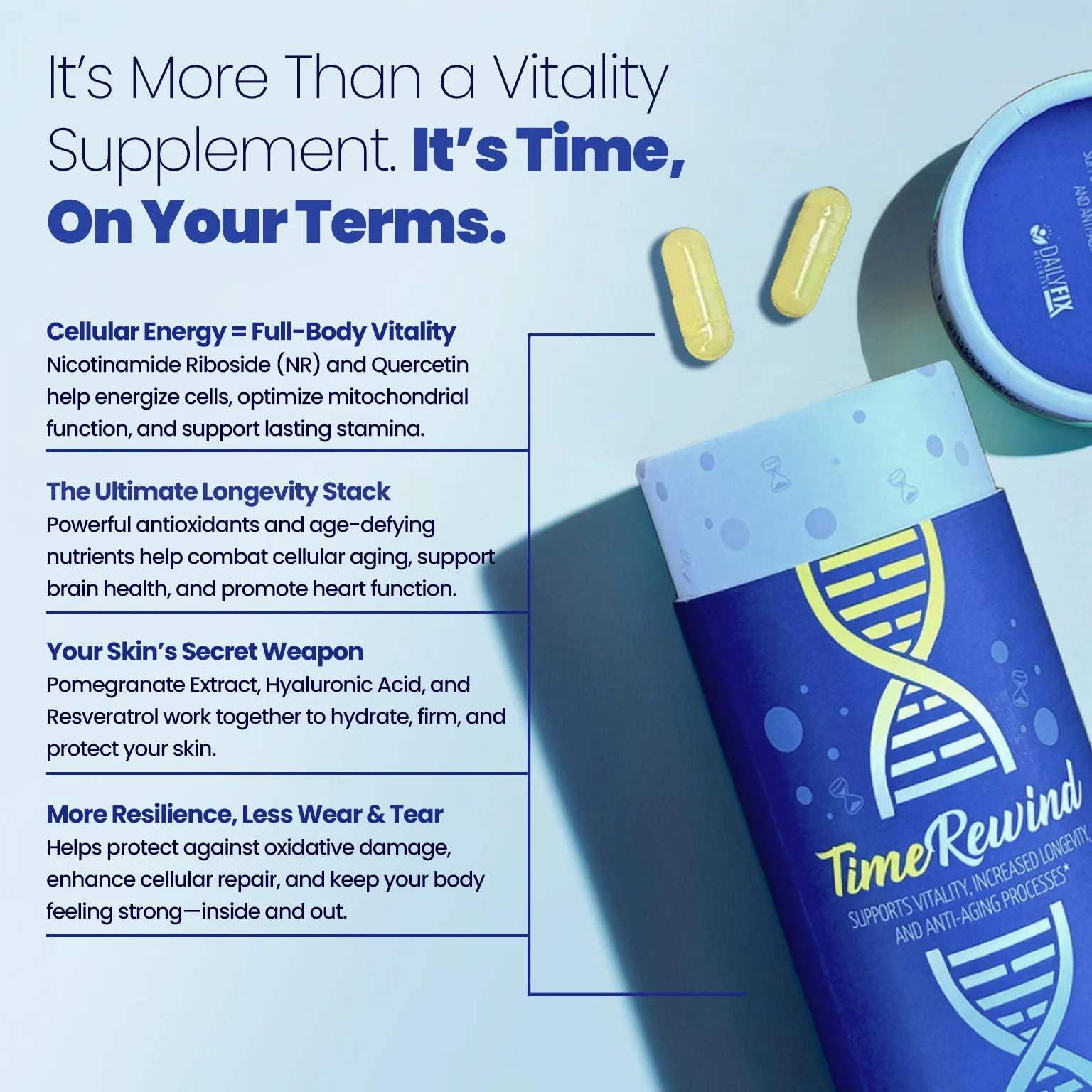 TimeRewind is your all-purpose formula for feeling vibrant, youthful, and energized—at every stage of life. Whether you’re looking to support graceful aging, boost vitality, or simply feel like the best version of yourself, this powerhouse supplement is designed to help you stay ahead of time, not chase it.