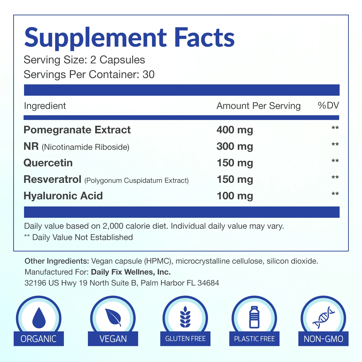 Pomegranate Extract, Hyaluronic Acid, and Resveratrol work together to hydrate, firm, and protect your skin, so you don’t just feel younger—you look younger.